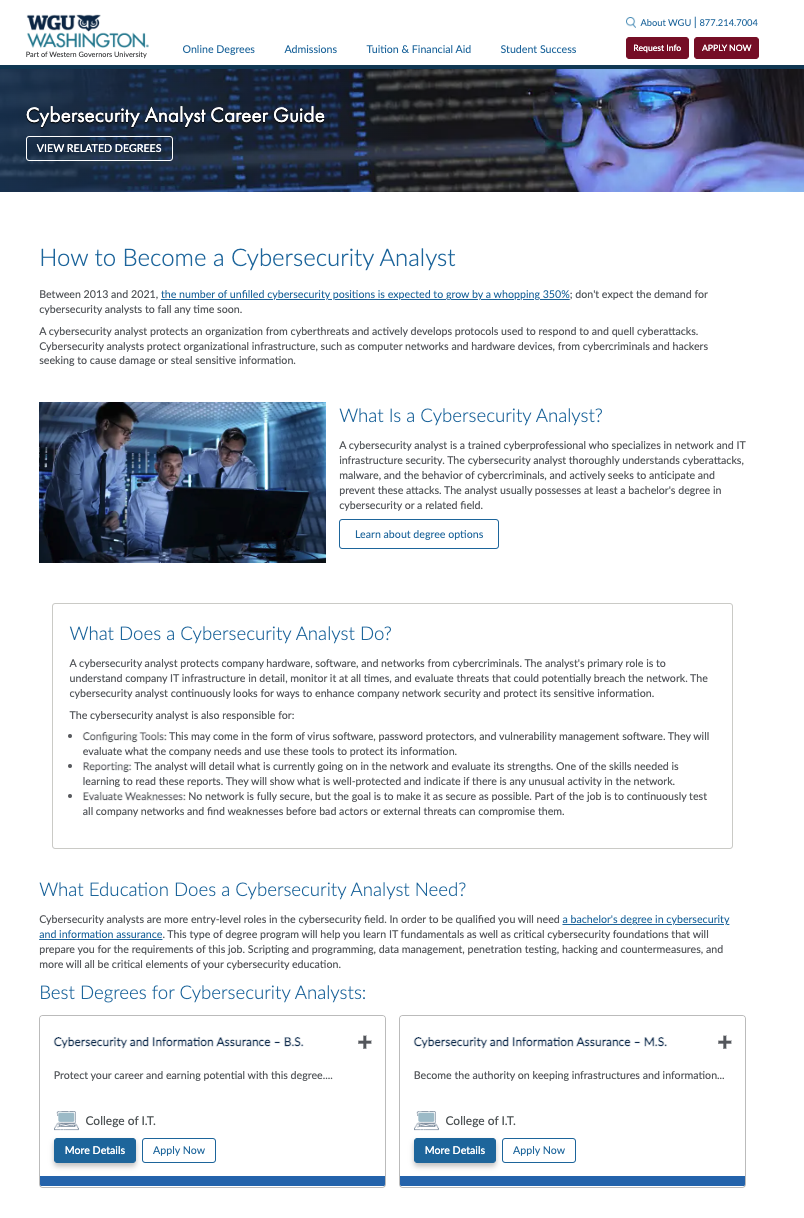 Cybersecurity Analyst career guide page — Control page