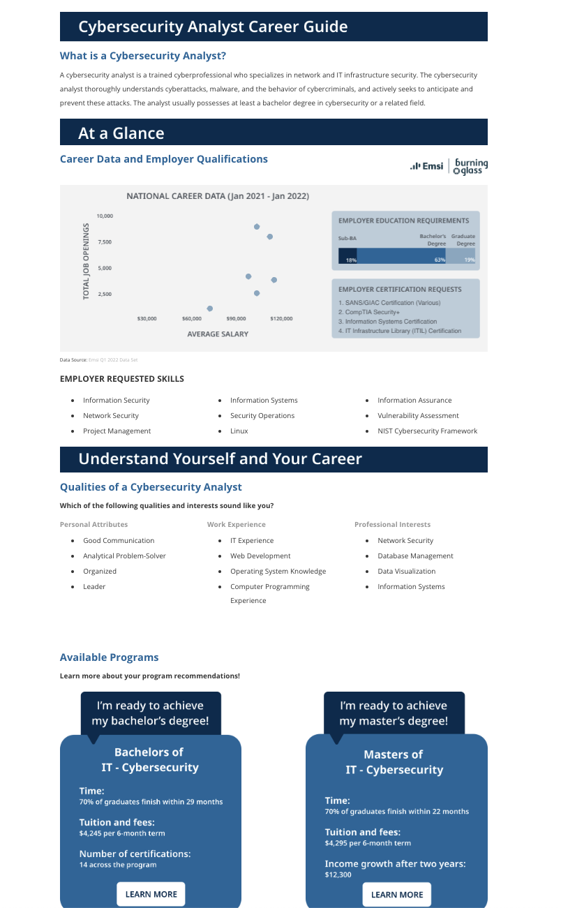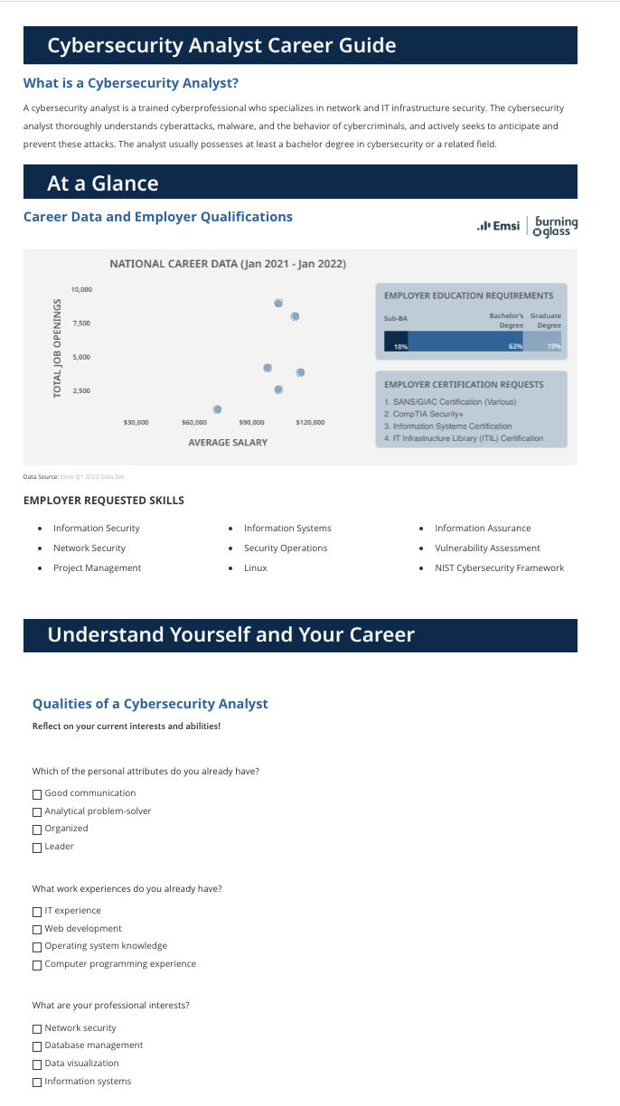 Cybersecurity Analyst career guide page — Version 1 (Require user input)