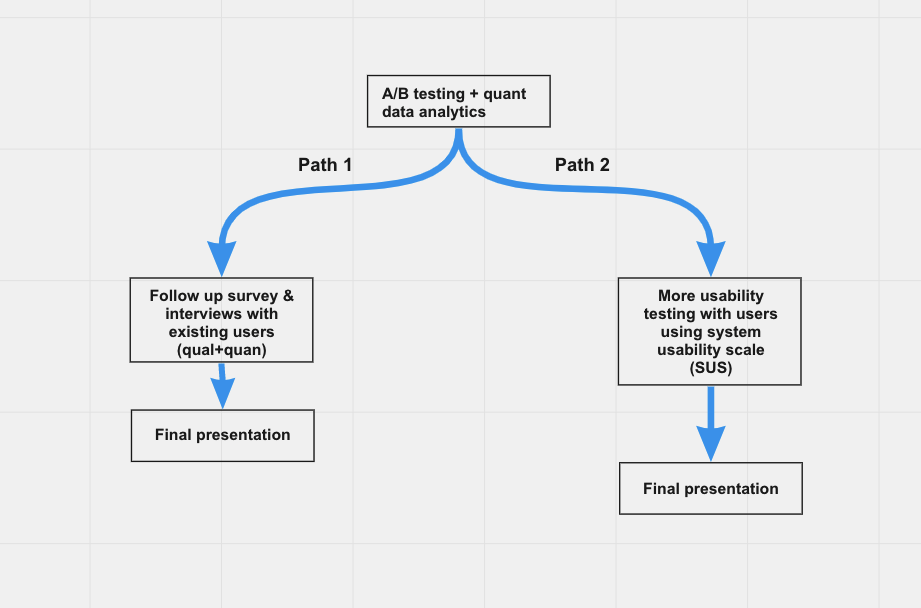 Usability testing, A/B testing, follow-up survey, follow-up interviews