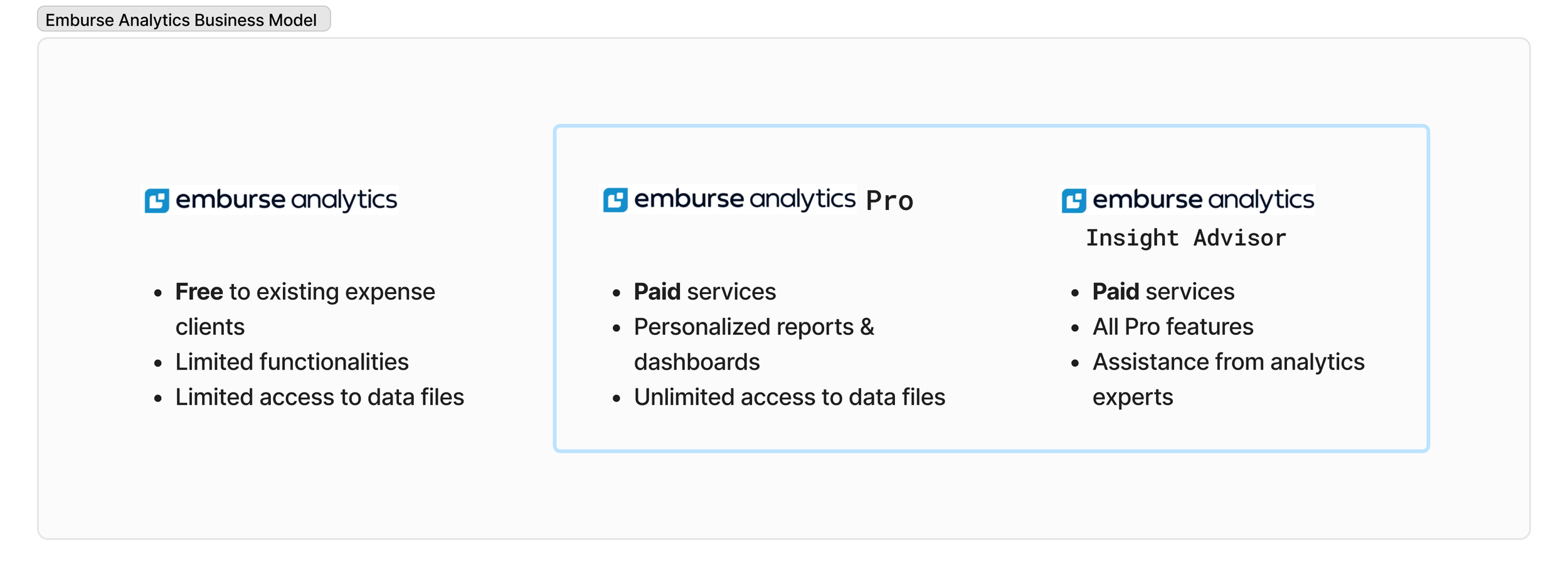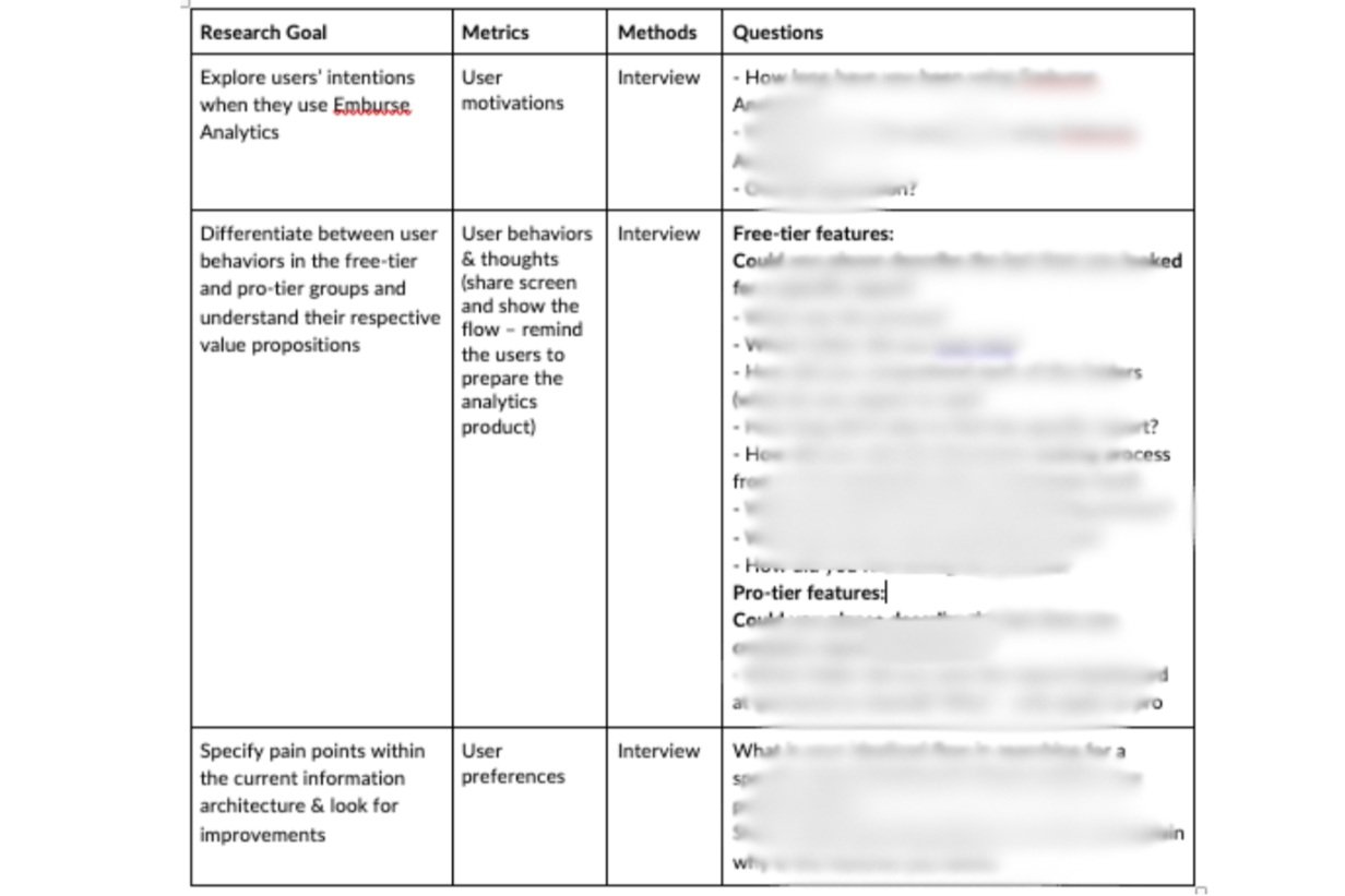 Emburse Analytics is a crucial component of our expense management ecosystem. To enhance our value proposition and build competitive advantage, the company has decided to focus on better understanding current user behaviors and increasing efforts to promote Pro upgrades.