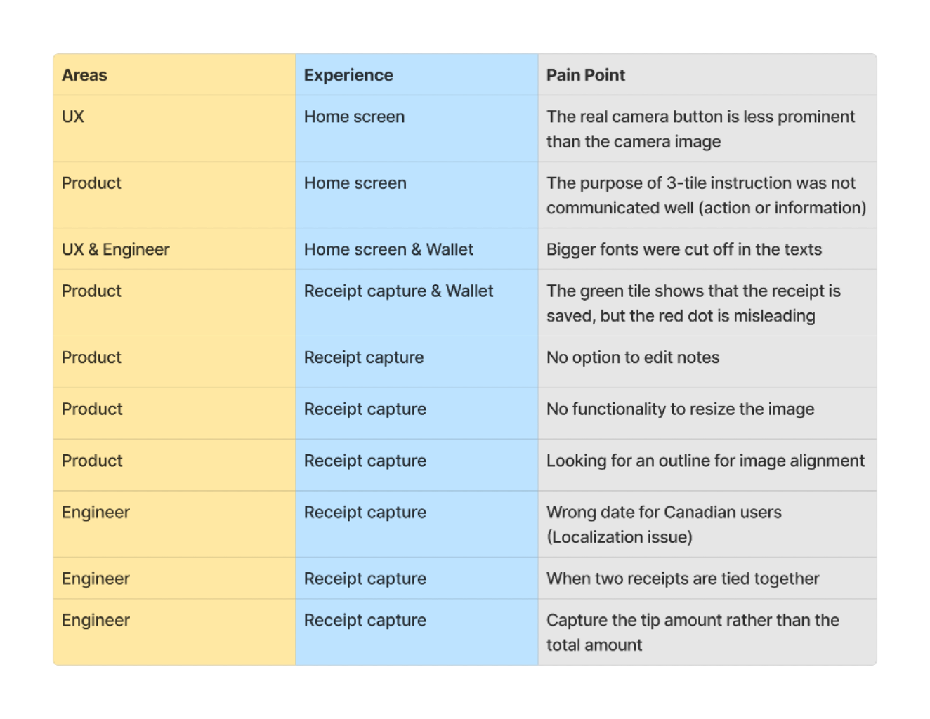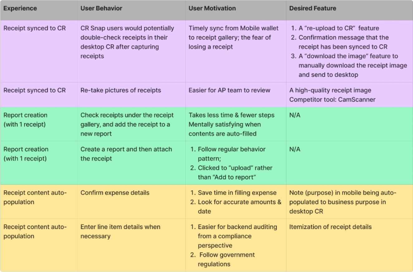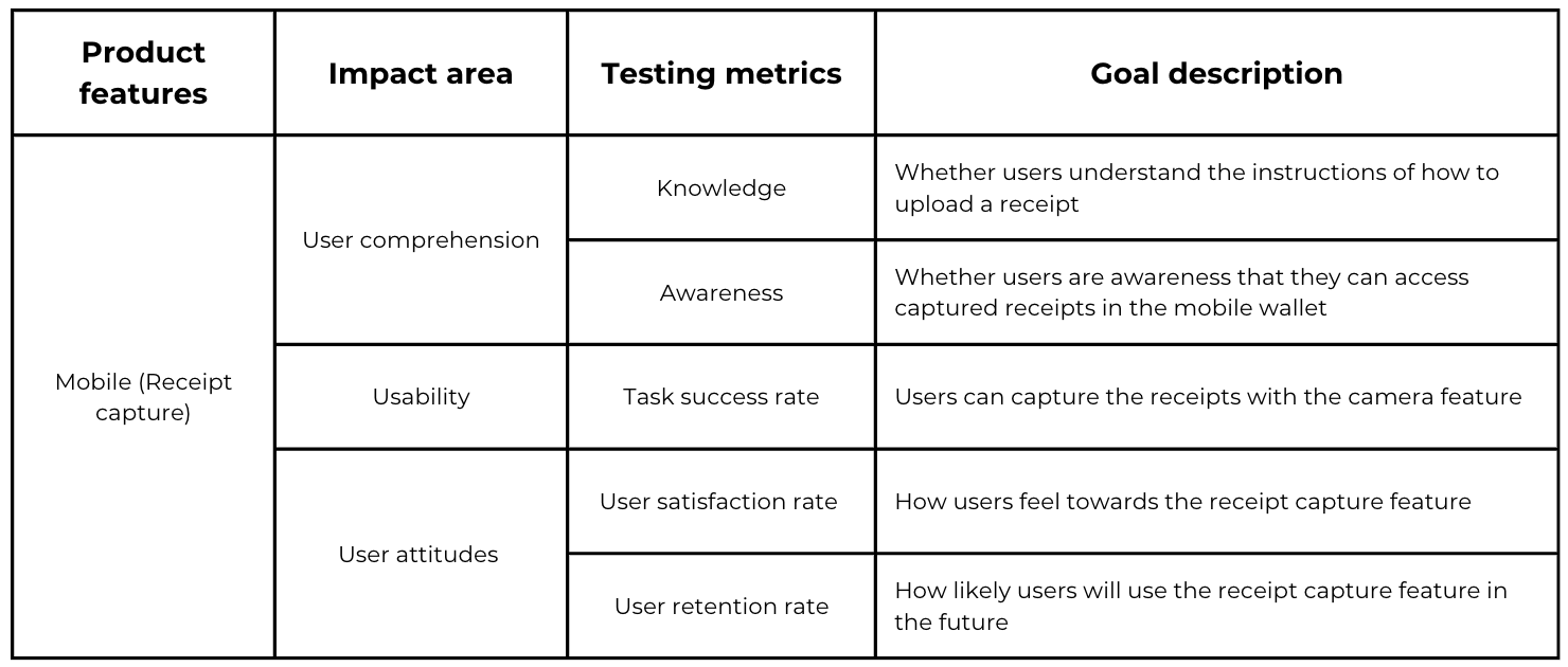 With the overarching goal in mind: Understand mobile-to-web experience with both admins & end users, I started looking into product features, analyze user flow step by step, and think aloud over the metrics I would like to gather. Here I gave mobile (receipt capture feature) as an example, I looked into comprehension, specifically knowledge & awareness.